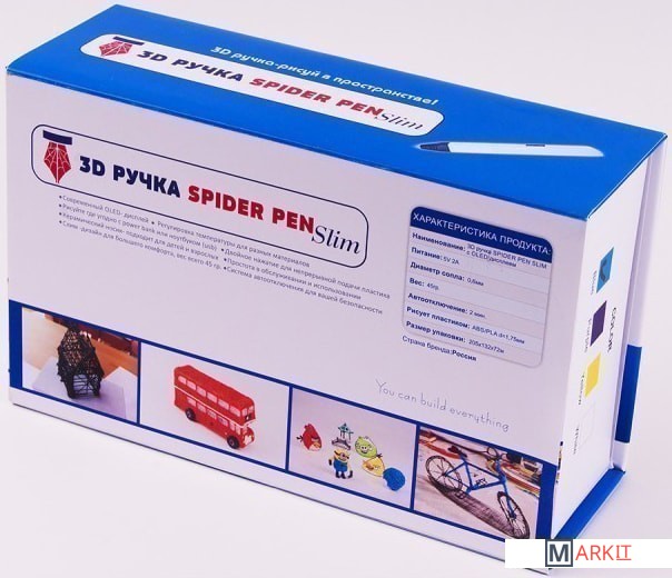 Комплектация - 3D ручка Spider Pen SLIM с OLED дисплеем;- Блок питания;- USB-кабель;- Демо-комлект пластика 10 метров;- отвертка для регулировки температуры;- Инструкция на русском языке;- Книга трафаретов.