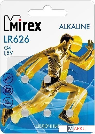 Батарейка Mirex LR626 производится по специальной технологии “AntiLeaX», что при соблюдении условий хранения и эксплуатации сводит риск вытекания электролита практически к нулевым показателям. Элемент LR626 взаимозаменяем с подходящими ему по форме аналогами, которые располагают маркировкой «AG4» или «LR66» на своём корпусе.