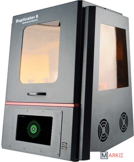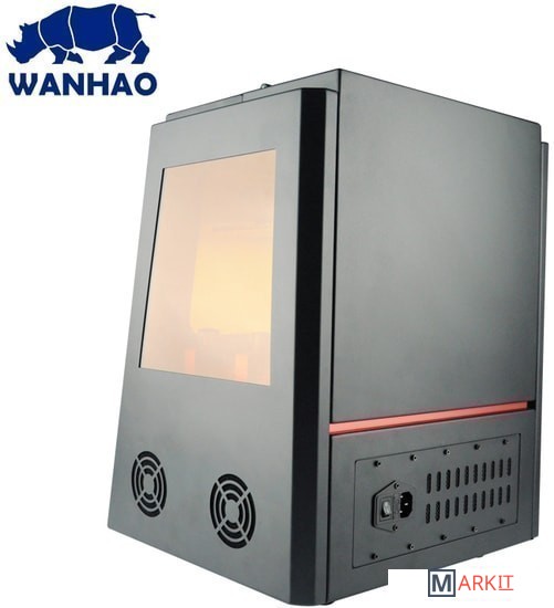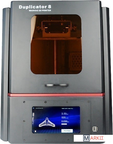 Основные особенности Wanhao В8:- LCD экран 8,9 дюйма с разрешением 2K HD;- Большой сенсорный дисплей позволяет устанавливать настройки и контролировать печать в реальном времени. На экране отображаются данные: время печати, текущая температура, количество слоев, изображение модели, уровень смолы, датчик калибровки, usb-индикатор, сеть Wi-Fi и пр. - На окошке с боковой стороны ванны расположена мерная шкала для контроля уровня полимера. Также через него можно наблюдать за печатью (прилипла ли модель к платформе, насколько успешно проходит печать);- Имеется внутренняя система очистки воздуха с активированным углем;Скорость печати 33 мм/час.