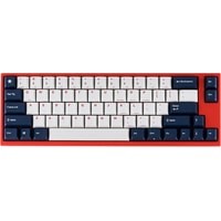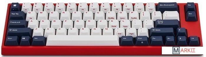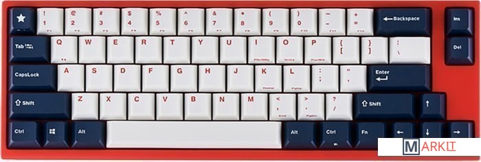КЛАВИАТУРА БЕЗ КИРИЛЛИЦЫТип: линейныйСила нажатия: 60 грамм (тяжелые)Длина пути: 4 мм (2 мм до срабатывания)Данная модель имеет красно-белую расцветку с тёмно-синими клавишами-модификаторами — очень смелое и яркое цветовое решение. Собрана клавиатура добротно и монолитно, а сочетание высококачественных double-shot PBT клавиш с переключателями Cherry MX и звукопоглощающей подложки позволяет сделать печать на клавиатуре максимально тихой (насколько это возможно для механики). Mini-USB порт вынесен на верхний правый торец клавиатуры, поэтому если вы часто носите клавиатуру с собой, подключение и отключение клавиатуры будет мгновенным и без лишней возни.За счет использования FN-слоя клавиатура имеет аналогичную полноразмерным клавиатурам функциональность при своем компактном размере.DIP-переключатели на задней панелиДают возможность поменять местами функции кнопок Ctrl и Caps Lock, Windows и Alt, Windows и Fn или отключить Windows.Звукопоглощающая подложкаПоглощает звуки при нажатии, делая процесс печати более тихим по сравнению с обычными механическими клавиатурами.Низкопрофильные клавиши Step-Sculpture2Данные клавиши заметно ниже и имеют оптимальный угол наклона, из-за чего, по отзывам, печатать приятнее и комфортнее, чем на более высоких клавишах.Функция Full N-key Rollover по PS/2 (NKRO)Стандартное подключение через USB позволяет одновременно нажимать до 6 клавиш (6KRO), этого хватит любому обычному человеку независимо от его скорости печати.Подключение через PS/2 разрешает одновременно нажимать любое количество клавиш (NKRO) — пригодится геймерам, которым нужно часто прожимать более 6 клавиш почти моментально.