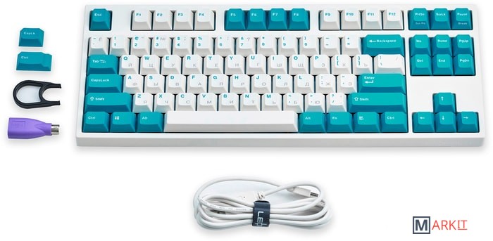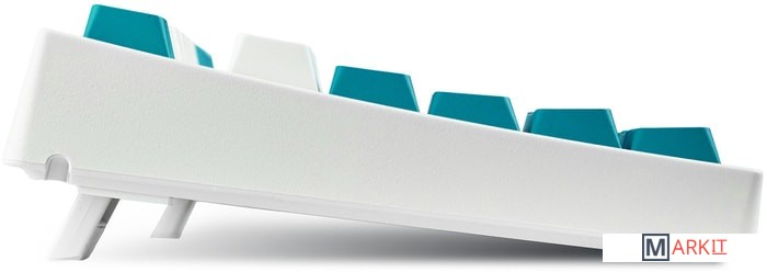 Тип: тактильныйСила нажатия: 55 грамм (средние)Длина пути: 4 мм (2 мм до срабатывания)Данная модель выполнена в белом цвете с мятно-голубыми клавишами-модификаторами — расцветка получилась очень свежей и приятной. Клавиатура собрана добротно и монолитно, а сочетание высококачественных double-shot PBT клавиш с переключателями Cherry MX и звукопоглощающей подложки позволяет сделать печать на клавиатуре максимально тихой (насколько это возможно для механики). Mini-USB порт спрятан в центре под корпусом, а на самой клавиатуре имеются центральная и две боковые канавки под кабель.Клавиатура поддерживает сочетание клавиш для регулировки громкости и управления музыкой, также имеется возможность переключения между 6KRO и NKRO.DIP-переключатели на задней панелиДают возможность поменять местами функции кнопок Ctrl и Caps Lock, Windows и Alt, Windows и Fn или отключить Windows.Звукопоглощающая подложкаПоглощает звуки при нажатии, делая процесс печати более тихим по сравнению с обычными механическими клавиатурами.Низкопрофильные клавиши Step-Sculpture2Данные клавиши заметно ниже и имеют оптимальный угол наклона, из-за чего, по отзывам, печатать приятнее и комфортнее, чем на более высоких клавишах.Клавиатура совместима с Mac OSFN-слой работает (кроме клавиш F6, F8, F9), а поменять местами клавиши-модификаторы можно в системных настройках. Проверено с MAC OS 10.13Функция Full N-key Rollover по USB (NKRO)Позволяет нажимать одновременно неограниченное количество клавиш. Для печати идеально подойдет как 6KRO, так и NKRO, независимо от вашей скорости. Для игр NKRO будет плюсом и неважно, нажимаете ли вы больше 6 кнопок или нет, поскольку, играя в любую игру, вы можете случайно нажать пару лишних клавиш и из-за этого клавиатура имеет шанс не среагировать на нажатие, которое вы хотели совершить изначально. Имеется возможность переключения между NKRO и 6KRO через FN сочетания.