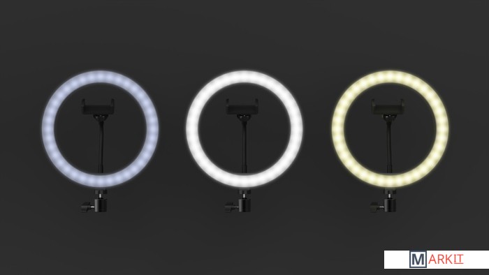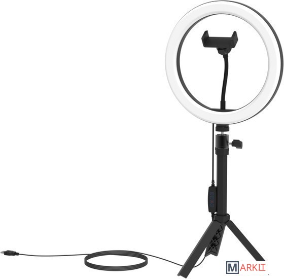 Кольцевая лампа диаметром 26см в комплекте с настольным штативом имеет 9 уровней яркости и 3 цветовых температуры: теплый, нейтральный и холодный свет, . Питание от USB-порта.