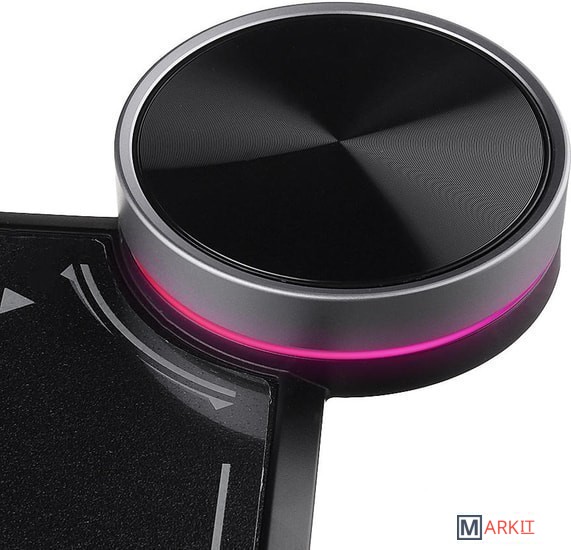 Данный коврик оснащен функцией беспроводной зарядки стандарта Qi. Благодаря этому его можно использовать не только для подзарядки мышки, но и мобильного телефона. Также оснащен колесом управления подсветкой.