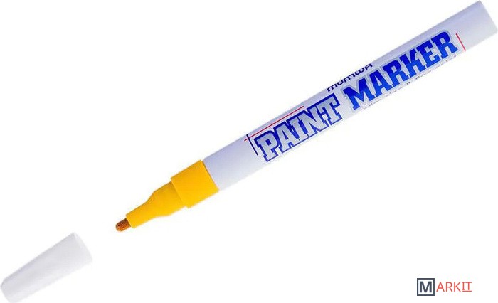 Маркер-краска MunHwa — профессиональный красящий состав на нитрооснове, помещенный в прочный алюминиевый корпус длиной 14 см. В быту изделие можно использовать для маскировки дефектов на обуви, корпусах бытовой техники и мебели, а также для реставрации покрытия кузова автомобиля, в торговых точках и на производстве — для маркировки товаров.Маркер оставляет четкий след на металле, стекле, дереве, керамике, картоне, пластике и других ровных непористых и малопористых основаниях.Рисует даже на ржавых, промасленных, запыленных деталях. Позволяет наносить надписи на разогретые до 130 °C поверхности.Благодаря дозированной подаче краска не разбрызгивается и не растекается.После высыхания надписи устойчивы к механическим воздействиям, морозу, влаге и выцветанию, могут подвергаться температурной обработке.Толщина линии - 2 мм.