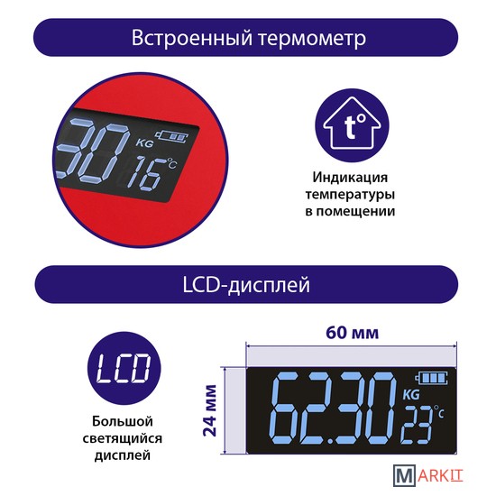 Функциональные особенности расчет доли воды, расчет доли жировой ткани, расчет доли мышечной ткани, расчет доли костной ткани, расчет ИМТ (BMI), индикация температуры помещения, индикация заряда батареи