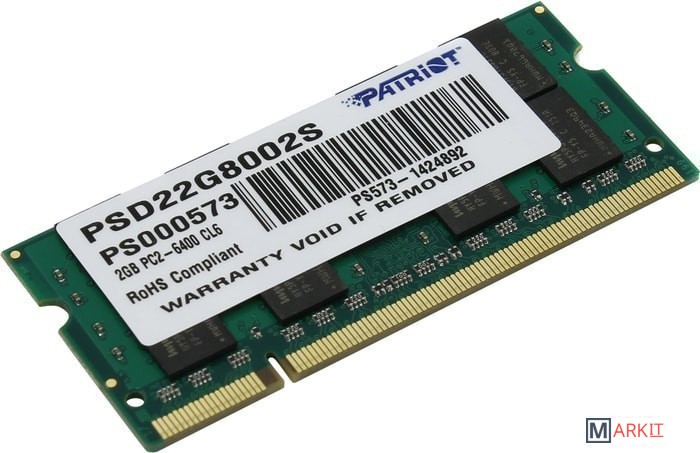 Markit » Оперативная память » Оперативная память Patriot 2GB DDR2 SO-DIMM PC2-6400 (PSD22G8002S)