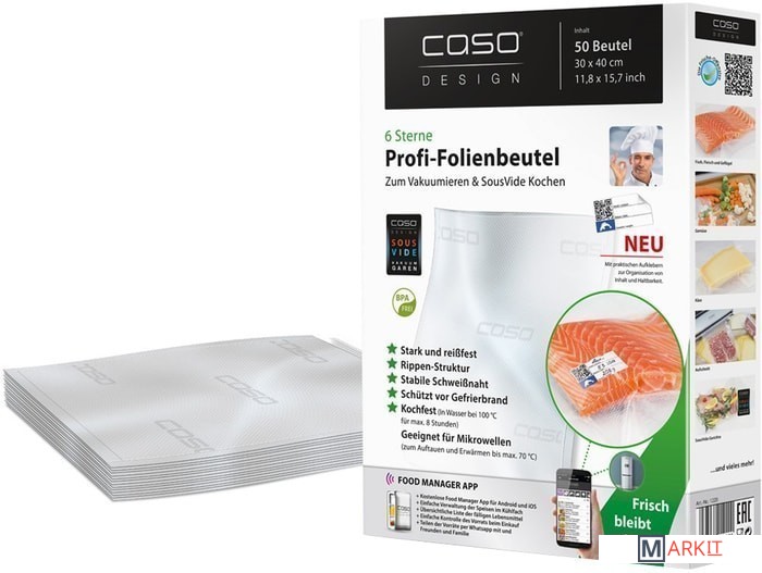 Очень прочная и устойчивая к разрыву плёнка толщиной 160 мкмРифлёная структура пакета для создания вакуумаКрепкий и надёжный шовВ комплекте стикеры с QR-кодом для маркировкиВитамины и минералы сохраняются дольшеПлёнка без BPAЗащищает продукты от морозного ожога и потери ароматаВозможно многоразовое использовании и мойка в ПММПриготовление продуктов при 100°C максимум 4 часа и в СВЧ до 70°CИдеально подходит для Sous VideПодходит для всех бескамерных вакуумных упаковщиковИспользуйте приложение CASO FOOD MANAGER для сканирования стикеров с QR-кодом и маркируете пакеты с продуктами. Таким образом, у вас всегда будет четкое представление о том, что находится в вашем холодильнике или морозильной камере, а так же Вы получите оповещение на свой телефон об окончании срока годности.Составляйте список продуктов с возможностью сортировки по типу продуктов (рыба, мясо, овощи) или месту хранения (холодильник/морозильник/шкаф)