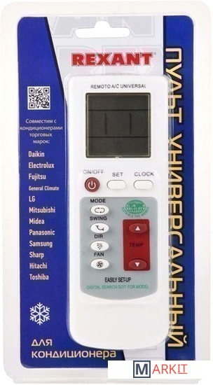 Пульт универсальный для кондиционеров (RX-100AII) REXANT подходит к более 1000 моделей кондиционеров различных кондиционеров.Совместим со следующими моделями:GREE , CARRLE, MIDEA, TOSHIBA, LANBO, CHANGHONG, FRESTECH, CHIGO, MACQUAY, PANASONIC, HUIFENG, HAIER, NANF, MITSUBISHI, DAYU, GALANZ,SAST, KELONG,HUABAO, SHENGFENG, AUX , YAIR, SHARP,SHENGBAO, WANBO, DAIKIN, POLKA, HISENSE, TIANYUAN, FUSHITONG, TOBO, HUALING, FEILU, LG. XIAOYA, HITACHI, DEER, TCL, LIANGYU, SANYO, LITTLE SWAN, WHIRPOOL, SUOWA, ROWA , LANGGE, ELECTROLUX, CROWN, YORK, ZHONGLI, AUOMA, TALANDI, CHUNLAN, WUFFENG, XINKE ,SAMSUNG и др.