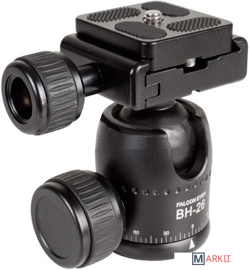 Falcon Eyes ВН-26 — шаровая штативная голова, представляет собой конструкцию из алюминиево-магниевого сплава со стальным полированным шаром и быстросъемной площадкой. Особенностью шаровой головы является возможность контролировать все три оси движения одним замком.