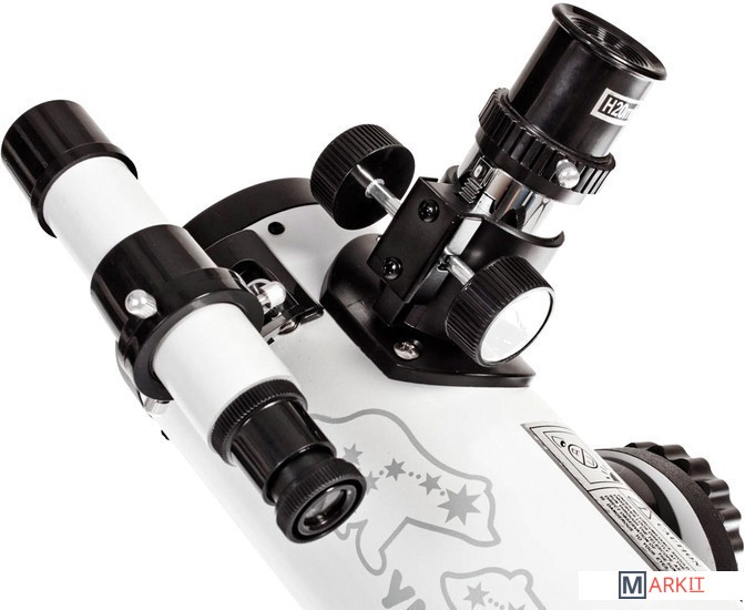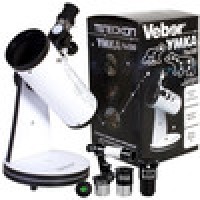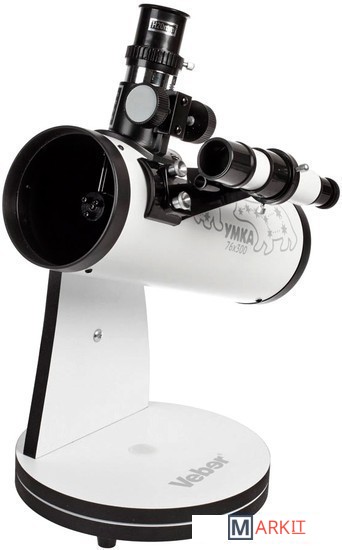 Телескоп Veber Умка 76/300 это классический рефлектор Ньютона на азимутальной монтировке «турельного» типа (Монтировка Добсона). При таких небольших размерах (длина трубы 300 мм, 76 мм диаметр) может показаться, что это детский телескоп, но посмотрите в него- и ваше мнение изменится кардинально. Тем более, что с увеличением 15 крат (окуляр Н20 мм) вы сможете сфокусироваться и днем на любые объекты. Этот телескоп можно использовать и как настольную зрительную трубу.