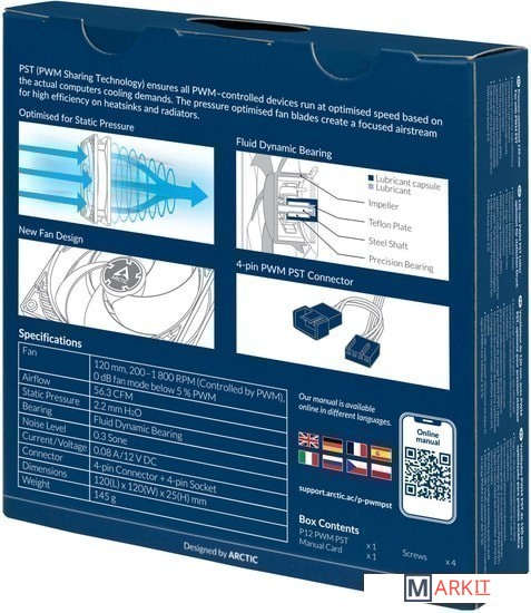 Вентилятор с поддержкой технологии PST от Arctic - возможность подключения цепочкой до 5 вентиляторов от одного 4pin разъема. Процессорный вентилятор должен быть последним в цепочке.