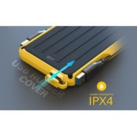 Armor A66 - это настоящий «внедорожник» среди портативных накопителей, который легко справится с ударами, падениями, попаданием под ливень в отпуске и бытовой пылью в офисе. Корпус устройства защищён мягким резиновым бампером, который помогает поглотить силу удара при случайном падении и защищён от попадания брызг и капель воды со стандартом водонепроницаемости IPX4, что помогает сохранить накопитель в целости и сохранности.