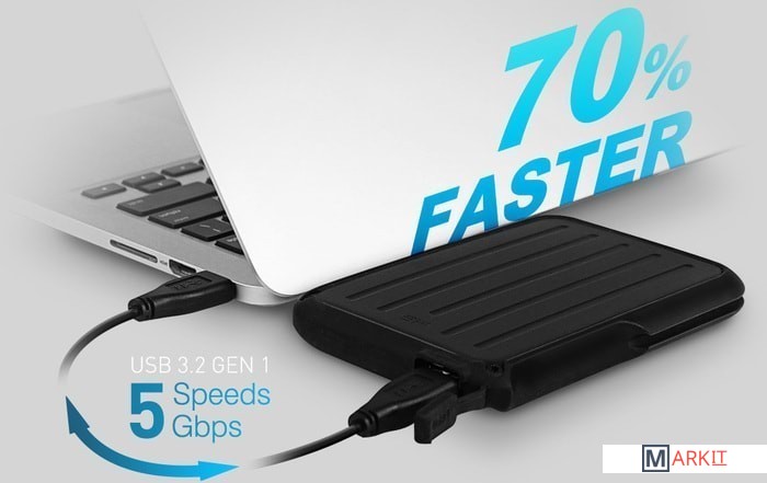 Armor A66 - это настоящий «внедорожник» среди портативных накопителей, который легко справится с ударами, падениями, попаданием под ливень в отпуске и бытовой пылью в офисе. Корпус устройства защищён мягким резиновым бампером, который помогает поглотить силу удара при случайном падении и защищён от попадания брызг и капель воды со стандартом водонепроницаемости IPX4, что помогает сохранить накопитель в целости и сохранности.